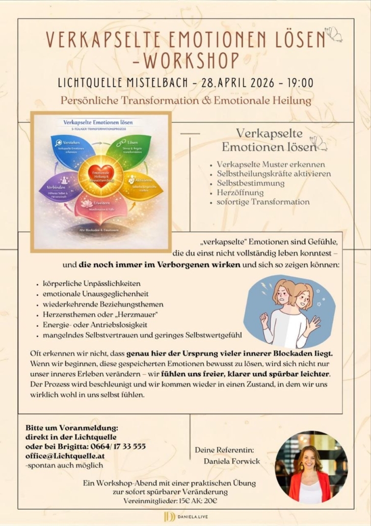 VERKAPSELTE EMOTIONEN LÖSEN – WORKSHOP Dienstag, 28. April mit Daniela Forweck Wir bitten um Voranmeldung! https://www.lichtquelle.at/wp-content/uploads/2026/04/VErk.jpg 905 905 Brigitta Harrach https://www.lichtquelle.at/wp-content/uploads/2019/12/Lichtquelle-Mistelbach-Logo.png Brigitta Harrach2026-04-21 13:20:282026-04-21 13:22:09VERKAPSELTE EMOTIONEN LÖSEN – WORKSHOP